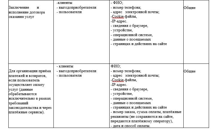 1.2.5. Выгодоприобретатели по договорам. Все вышеуказанные данные, а также информация, необходимая для оплаты: номер заказа, сумма оплаты, платёжные реквизиты (не сохраняются на сайте, передаются платёжному оператору), дата и способ оплаты.